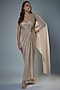 Tarun Tahiliani features a mesmerizing Ivory Shimmer Gown that captivates with its elegance. The eye-catching piece is crafted in metallic crinkle tulle. Accessorize the designer gown with dangler earrings and heels for wedding ceremonies, showcasing style and sophistication.