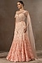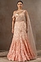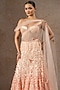 Tarun Tahiliani presents an ivory lehenga saree in soft net base with pearl embroidery. It is paired with a hand embroidered tulle net corset and a drape. Accentuate it with pearl jewellery and embellished heels for weddings, sangeet ceremony or cocktail soirees.