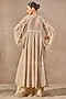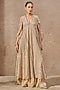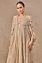 Tarun Tahiliani presents an ivory jacket in tulle base with resham embroidery, crystal, sequins, beads and pearl embellishments. It is paired with a bustier and pants. Accentuate it with statement jewellery and heels for a wedding, sangeet or engagement ceremony.