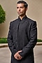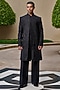 Featuring a black sherwani in georgette base with thread and diamond embroidery. It is paired with a cotton jacquard kurta and georgette flared trousers. Style it with a pair of loafers and a swarovski mala for black-tie festive events, sangeet or cocktail ceremony.