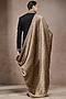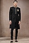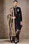 Featuring a black sherwani in silk velvet and japanese crepe base with zardosi embroidery. It is paired with a kurta, churidar and a brocade stole. Style it with mojaris for a wedding, sangeet or engagement ceremony.
