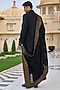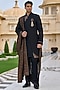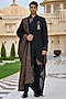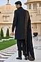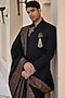 Featuring a black structured sherwani in suiting base. It is paired with a chanderi jacquard kurta, suiting trousers and a cotton jacquard embroidered shawl. Style it with a pair of velvet juttis and an onyx mala for black-tie festive events, wedding or reception ceremony.