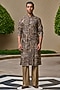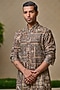 Featuring a brown kurta in cotton jacquard base with print. It is paired with suiting flared trousers. Style it with a pair of tan sandals and a leather strapped watch for festive dinners, pooja or sangeet ceremony.