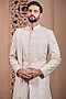 Featuring an ivory sherwani in raw silk base with hand embroidery. It is paired with a kurta, pants, a safa, a kamarband and a stole. Style it with mojaris for a wedding or engagement ceremony.