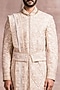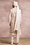 Featuring an ivory sherwani in katan silk base with resham and dori embroidery. It is paired with a matching silk jacquard pleated kurta, poplin lycra churidar pants, a kamarbandh, a stole, and a chanderi safa.