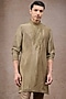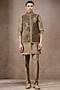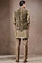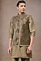 Featuring an olive waistcoat in silk velvet, silk dupion and suiting fabric base with threadwork and zardosi hand embroidery. It is paired with an embroidered kurta and churidar. Style it with mojaris for a wedding, sangeet or engagement ceremony.