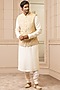 Featuring a salmon bundi jacket in silk dupion base with floral print and beige enameled buttons including aari and zardosi embroidery. This contains only one piece.