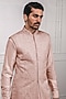 Featuring a salmon pink handcrafted sleeveless sherwani in georgette and cotton silk base with chikankari embroidery. It is paired with a matching kurta and dhoti pants.