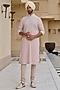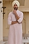 Featuring a salmon pink kurta in georgette base with chikankari, french knot and pearl embroidery. It is paired with poplin lycra churidar pants. Style it with a pair of kolhapuris and a bracelet for daytime festivals, family get-togethers or pooja ceremonies.