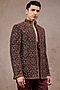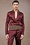 Featuring a wine bandhgala in silk velvet and charmeuse fabric base with zardosi embroidery. It is paired with an overlapped shirt, hand embroidered kamarbandh and trousers. Style it with shoes for a wedding, sangeet or engagement ceremony.