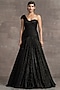 Featuring a metallic black gown in crinkle tulle base with a fluted bodice and a stylised one-shoulder sleeve.