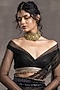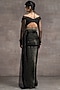 Featuring a metallic black concept saree in crinkle tulle and dolphin jersey base with crystal embellishments. It is paired with a matching fluted off-shoulder blouse having cutout detailing and sheer sleeves.