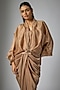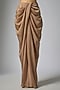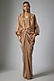 Featuring a mocha colored ruched top in satin organza base with a TT monogram brooch detail. It is paired with satin draped trousers and a jersey slip. Elevate it with statement earrings and block heels for evening soirees.