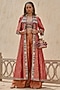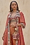 Featuring a multi-colored gharchola jacket in brocade base with beads, kundan and gota embellishment. It is paired with an embroidered bustier and flared pants. Accentuate it with statement earrings, sleek heels and a bold lip for a striking Indo-western look, perfect for weddings, festive soirees and grand celebrations.