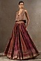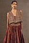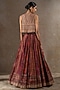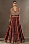 Tarun Tahiliani presents a multi-colored lehenga in chanderi base with print and swarovski stone detail. It is paired with a bustier and a bejeweled gilet. Accentuate it with polki jewellery and embellished heels for weddings or sangeet ceremony.