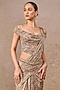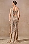 Tarun Tahiliani presents a multi-colored concept saree in foil jersey base with print. It is paired with an off-shoulder draped blouse having stones and crystal detail. Accentuate the designer saree with kundan polki or emerald jewellery, embellished heels and a potli bag, perfect wear for a wedding or mehendi ceremony.