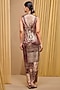 Tarun Tahiliani presents a multi-colored draped dress in foil jersey base with print and crystal brooch detail. Accentuate it with gold jewellery, embellished heels and a clutch, perfect wear for cocktail soirees or an evening look.