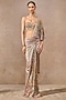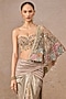 Tarun Tahiliani presents a multi-colored draped concept saree in foil jersey and tulle base with floral panel hand embroidery. It is paired with a corset inspired embroidered blouse having crystal tassels. Accentuate it with statement earrings and heels for cocktail parties.