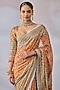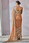 Tarun Tahiliani presents a multi-colored saree in georgette base with hand paint, including gota, mirror and sequins detail. It is paired with a silk dupion blouse. Accentuate the designer saree with kundan polki or emerald jewellery, embellished heels and a potli bag, perfect wear for a wedding or sangeet ceremony.