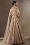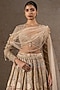 Tarun Tahiliani presents a multi-colored lehenga in tulle net base with floral motif hand embroidery. It is paired with a hand embroidered blouse and a drape having swarovski crystals. Accentuate it with pearl jewellery and embellished heels for weddings or sangeet ceremony.