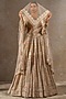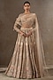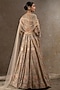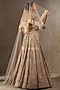 Tarun Tahiliani presents a multi-colored lehenga in tulle net base with floral motif hand embroidery. It is paired with a hand embroidered blouse, a veil and a dupatta having swarovski crystals. Accentuate it with pearl jewellery and embellished heels for weddings or sangeet ceremony.