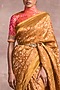 Featuring a mustard saree in brocade base. It is paired with a contrasting unstitched blouse.
