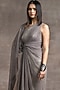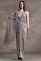 Featuring an oyster-shaded maxi dress in foil jersey base with a crinkle tulle asymmetrical drape and a cinched waistline.