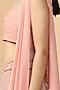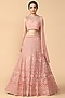 Featuring a peach lehenga skirt in italian tulle base with beads and pearl embroidery. It is paired with a matching fluted blouse in silk chiffon base and an attached draped dupatta.
