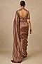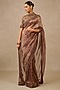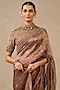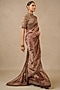 Tarun Tahiliani features a mesmerizing Plum Saree Set that captivates with its elegant ikat print. The eye-catching saree is crafted in silk tissue. It is paired with a silk velvet embroidered unstitched blouse piece. Style it with statement jewellery and heels for a wedding or festive occasion, showcasing style and sophistication.