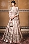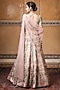 Featuring a powder pink anarkali in tulle and stretch net base with resham and badla embroidery. It is paired with a matching one shoulder drape and churidaar pants.