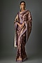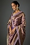 Tarun Tahiliani features a purple handwoven saree in brocade base with medallion motif and dori border. It is paired with an unstitched blouse. Accentuate the look with statement jewellery, embellished heels, and a sleek bun for festive occasions or weddings, evoking a perfect balance of contemporary grace and timeless allure.