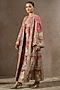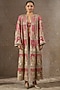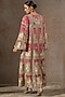 Tarun Tahiliani presents a red pichwai jacket in silk dupion and brocade base with crystal, thread and zardosi embellishment. It is paired with a brocade bustier and pants. Accentuate it with kundan polki or meenakari jewellery, embellished heels and a potli bag for a complete look, perfect wear for a wedding, sangeet or engagement ceremony.