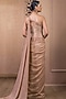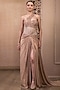 Tarun Tahiliani features a mesmerizing Rose Gold Dress that captivates with its elegance. The eye-catching sculpted dress is crafted in metallic crinkle tulle with crystal detailing and an extended drape. The designer dress is perfect for parties and events, showcasing style and sophistication.