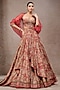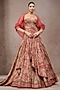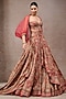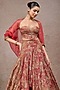 Tarun Tahiliani presents a rust draped lehenga in tussar silk base with print. It is paired with a corset bustier and a sheer silk cape. Accentuate it with statement jewellery and heels for weddings or sangeet ceremonies.