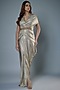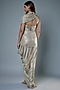 Tarun Tahiliani features a mesmerizing Silver Draped Gown that captivates with its elegance. The eye-catching piece is crafted in foil jersey with an embroidered waistband. Accessorize the designer gown with dangler earrings and heels for wedding ceremonies, showcasing style and sophistication.