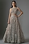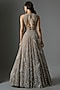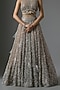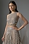 Featuring a silver lehenga in sequins base with embroidery. It is paired with a tulle blouse having swarovski crystal detail and a drape. Accentuate it with zircon jewellery and block heels for weddings, sangeet or engagement ceremonies.