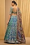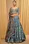 Tarun Tahiliani presents a teal and multi-colored lehenga in kasab satin base with print and crystal embellishments. It is paired with an embroidered blouse and a printed sheer silk dupatta. Accentuate the designer lehenga with kundan polki, embellished heels and a potli bag, perfect wear for a wedding or sangeet ceremony.