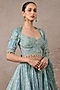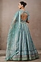 Tarun Tahiliani presents a turquoise lehenga in sheer silk and chanderi base with print and hand embroidery. It is paired with a hand embroidered blouse and a printed dupatta. Accentuate the designer lehenga with kundan polki, embellished heels and a potli bag, perfect wear for a wedding or sangeet ceremony.