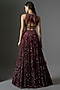 Featuring a wine lehenga in sequins base with embroidery. It is paired with a tulle blouse having swarovski crystal detail and a drape. Accentuate it with zircon jewellery and block heels for weddings, sangeet or engagement ceremonies.