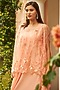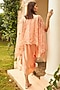 Featuring a peach scalloped cape in satin silk and net base with floral embroidery. It is paired with a slip dress. Style it with hoop earrings and heels for a festive occasion.