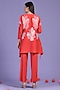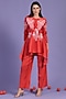 Featuring a red top in pleated polyester base with floral print. It is paired with pants. Style it with dangler earrings and heels for festive occasions.