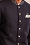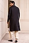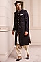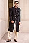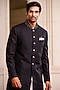 Featuring a black sherwani in linen base with handmade buttons. It is paired with salwar. Style it with a pair of mojaris and malas for a wedding, sangeet or engagement ceremony.