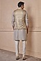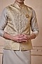 Featuring a gold bundi jacket in brocade base. It is paired with a kurta and aligarhi pants. Style it with mojaris for a festive occasion, pre-wedding, sangeet or engagement ceremony.