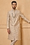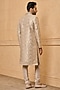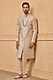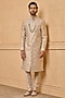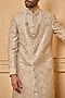 Featuring a gold sherwani in brocade and polyester blend base. It is paired with a kurta and churidar. Style it with a pair of mojaris, safa and malas for a wedding or engagement ceremony.