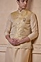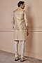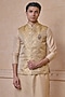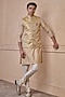 Featuring a gold bundi jacket in polyester and metallic fabric base. It is paired with a kurta and aligarhi pants. Style it with mojaris for a festive occasion, pre-wedding, sangeet or engagement ceremony.