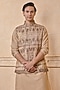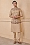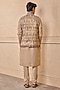 Featuring a gold bundi jacket in rayon, metallic and polyester base with print. It is paired with a kurta and pants. Perfect for a festive occasion, wedding or engagement ceremony, exuding charm and elegance.