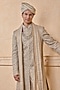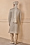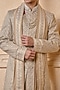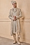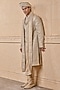 Featuring a gold sherwani in viscose blend base with embroidery. It is paired with a kurta, churidar and a stole. Style it with a pair of mojaris, safa and malas for a wedding or engagement ceremony.