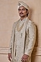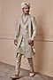Featuring a gold sherwani in viscose blend base. It is paired with a kurta, churidar and a stole. Style it with a pair of mojaris, safa and malas for a wedding or engagement ceremony.