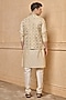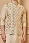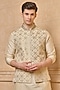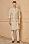 Featuring a gold bundi jacket in viscose polyester metallic base with embroidery. It is paired with a kurta and churidar pants. Style it with mojaris for a festive occasion, wedding or engagement ceremony.