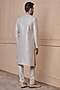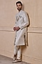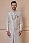 Featuring an ivory sherwani in brocade and polyester blend base. It is paired with a kurta and churidar. Style it with a pair of mojaris, safa and malas for a wedding or engagement ceremony.